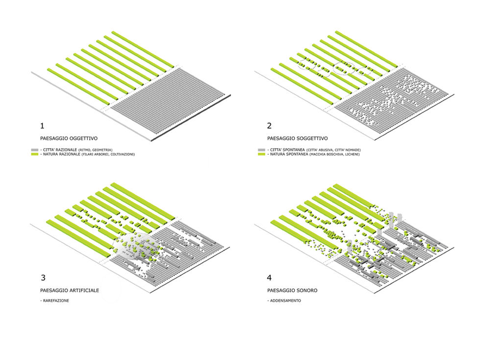 Il progetto riflette il desiderio di collegare la parte naturale a quella edificata dello schema insediativo di VEMA come risposta alla separazione creata dagli assi previsti per i collegamenti principali all’interno della città. Nel procedimento progettuale, un semplice schema razionale parco/città viene frammentato introducendo la logica della spontaneità tipica dei sistemi naturali e, nella città, dalla caratteristica mancanza di regole degli insediamenti abusivi. A tale scopo i suoni immaginari che permeano la natura e la città modificano una struttura urbanistica nata per rispondere a esigenze puramente funzionali. La pressione dal basso crea uno scollamento della superficie del suolo e genera un grande spazio ibrido tra città e natura in cui suoni e rumori si sovrappongono. Un ambiente intermedio in cui l’architettura segue la logica di un paesaggio sonoro, dove gli spostamenti avvengono liberamente secondo modalità e mezzi di trasporto compatibili con l’idea di parco. Gli elementi edificati seguono lo stesso processo di trasformazione del modello di città. Un tessuto periferico basso e regolare, si frammenta e cresce in altezza modificandosi in schemi tipologici differenti. Le basse abitazioni a patio sono coperte da orti comuni a cui si accede attraverso grandi lucernari che fuoriescono dal piano della copertura. Questi spazi hanno in comune la caratteristica di poter crescere e trasformarsi grazie alla prefabbricazione e alla modularità. All’interno del rigonfiamento si trovano una discoteca e un auditurium. Le due funzioni delimitano un grande spazio coperto che, come una immensa serra, può ospitare grandi eventi musicali.